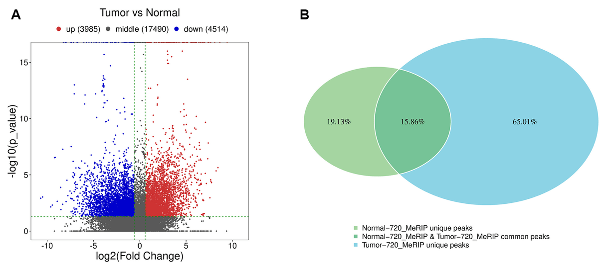 Figure 2: Abnormal levels of m6A modified mRNA are related to multiple pathways in breast cancer. A. The volcano plot of differential methylation sites of breast cancer tissues compared with adjacent normal tissues. B. Venn diagram (right panel) of common (intersection region) and unique peaks (non-intersection region) of breast cancer tissue compared with adjacent normal tissue. Modified from [13], licensed under CC BY 4.0.