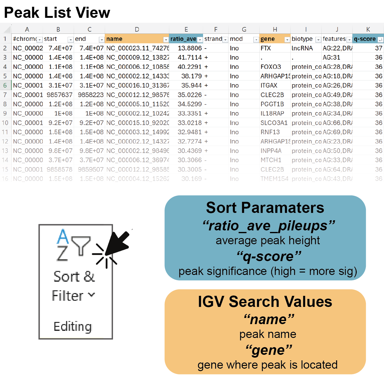 It can be difficult to know where to start when working with large datasets. One of the best ways to start navigating through data is to start with the most highly modified genes and regions in the sample. These regions are often cell-type specific, and can act as a point of reference for characteristics of intense and confident signal. You can locate these modified regions in a given sample by looking at its peak list. An example peak list can be found below: