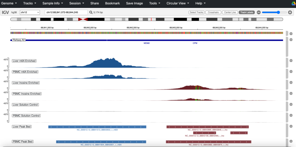 Links to the m6A and inosine peak lists are available for download. The peak lists contain relevant gene information associated with the modified regions of interest. This includes the coordinates and intensity of each peak, gene feature annotations, and statistical confidence and known molecular patterns.