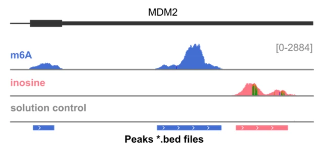 Genome browser view of the MDM2 gene, showing modified regions with m6A and inosine.