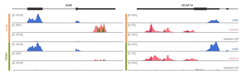Comparison of two arbitrary genes and their modification pattern obtained by analyzing RNA isolated liver tissue or Peripheral Blood Mononuclear Cells (PBMCs). The AHR gene shows preservation of the m6A sites in both sample types, whereas the inosine sites are missing in PBMC RNA. In the DCAF16 gene, the inosine sites are present in both samples, whereas the abundance of m6A is diminished in liver RNA.
