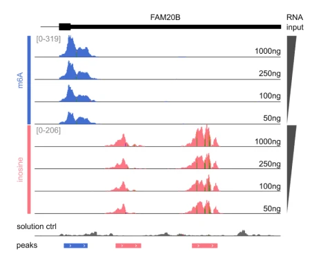 Genome browser view of the FAM20B gene. Sample input was titrated between 1,000 ng to 50 ng of total RNA. The m6A and inosine peaks are detected at all RNA input concentrations, with the raw read counts titrating with input concentration.