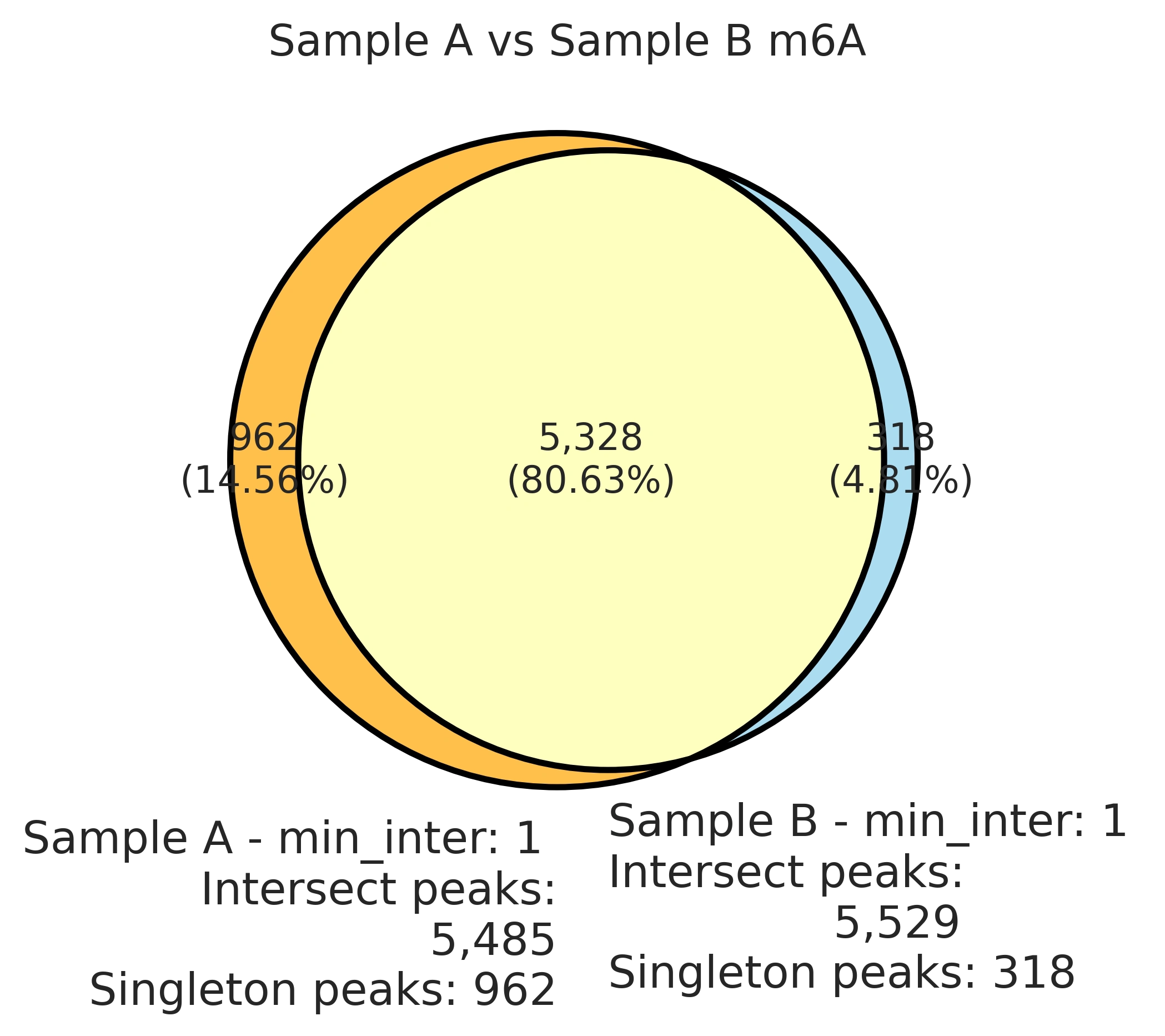 Venn diagram of the m6A peak locations in rep1 versus rep2. More than 80% of the m6A peaks are found in the exact same location in both technical replicates.