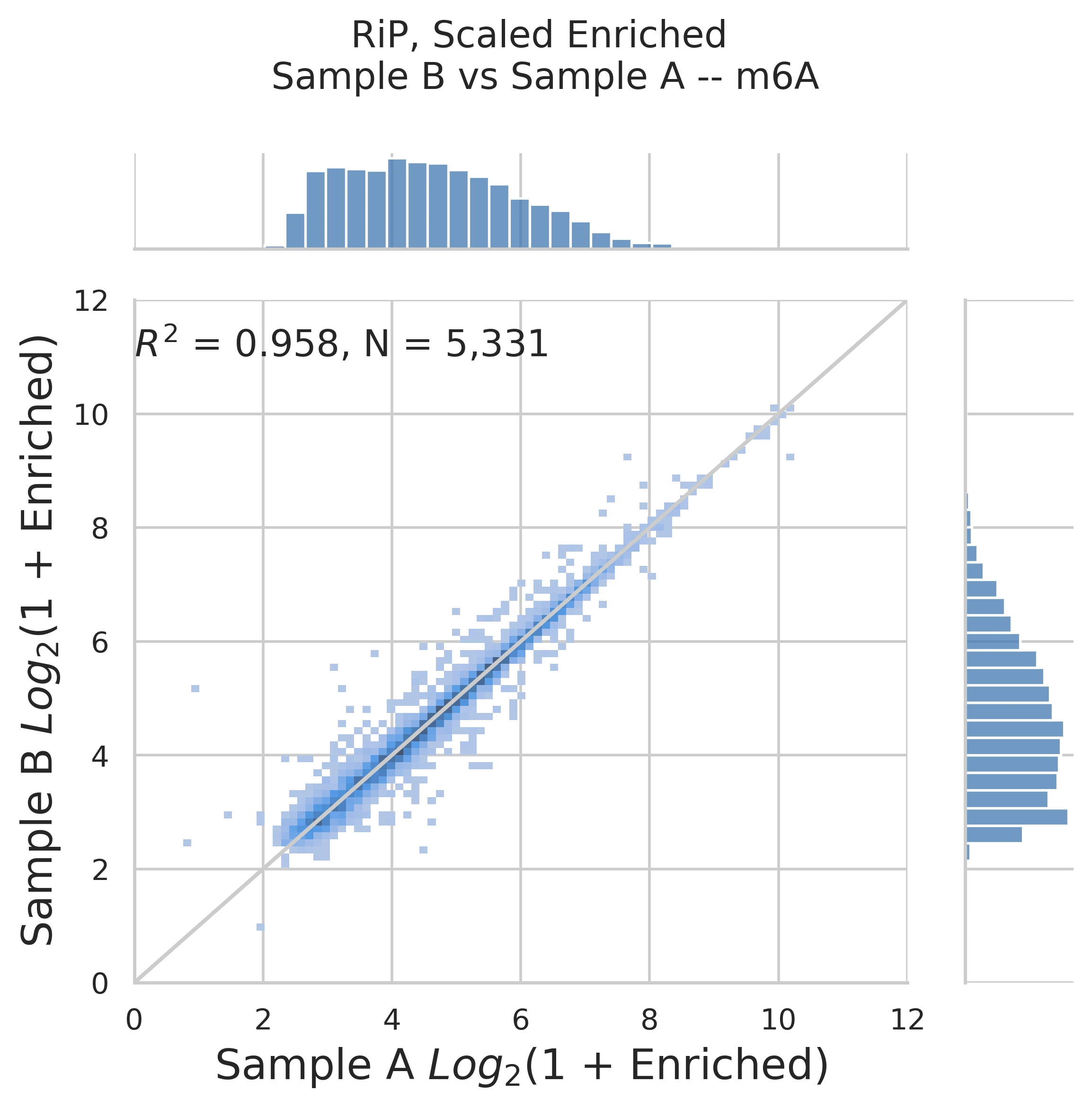 Correlation plot of the fold enrichment values of all m6A peaks found in rep1 versus the same in rep2. R2 > 0.8 demonstrates high reproducibility of the RNA mod abundance calculation.
