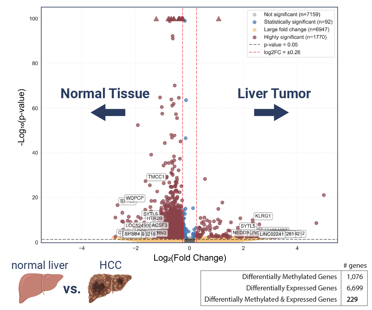 Using a machine learning trained peak caller and a quantification module that leverages the integrated spike-in controls, the EpiScout software delivers high-confidence differential methylation information, which is visualized through volcano plots for intuitive sample-to-sample comparison. Profiling RNA methylation in matched tumor–normal liver tissue from a hepatocellular carcinoma patient reveals a global hypomethylation signature, reflected by a leftward shift in the volcano plot. Despite this global trend, both hypo- and hyper-methylation occur at individual transcripts, highlighting the need to distinguish widespread effects from transcript-level differential methylation.