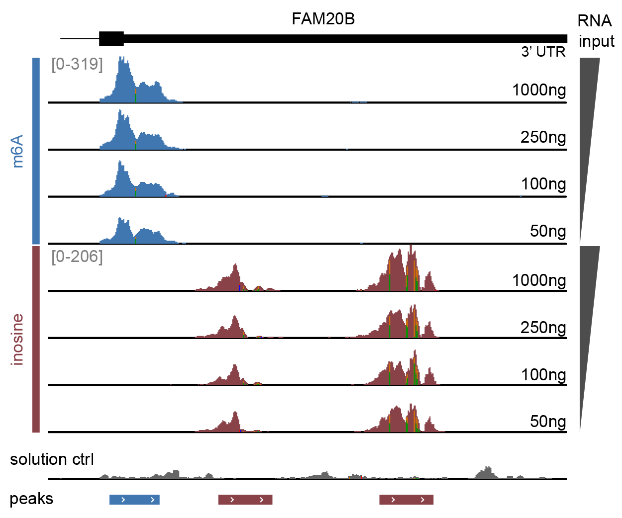 over a range of RNA inputs. Sequencing data were trimmed, aligned, deduplicated and split by modification barcode, with separate read tracks for m6A (blue), inosine (red) and the solution control (grey). Enrichment with EpiPlex binders generates peaks indicating the presence of RNA modifications. The bed file marks peak locations as identified by the EpiScout peak caller.