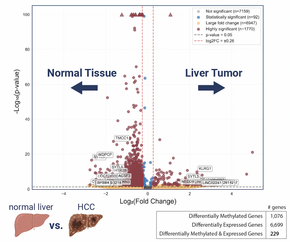 across paired tumor/normal liver tissue RNA. Using a machine learning–trained peak caller and a quantification module that leverages integrated spike-in controls, EpiScout delivers high-confidence differential methylation information, visualized through volcano plots for intuitive sample-to-sample comparison.